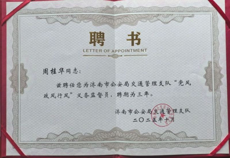 2025年10月 24 日下午,济南市交警支队举行党风政风行风监督员聘任仪式暨警营开放活动,本次共聘任社会监督员12 人,山东正唐律师事务所主任周桂华受聘,这是周桂华主任继2020年11月受聘济南市公安局交警支队党风政风行风监督员后的第二次受聘。济南市公安局副局长、交警支队支队长李海为周桂华主任颁发聘书。