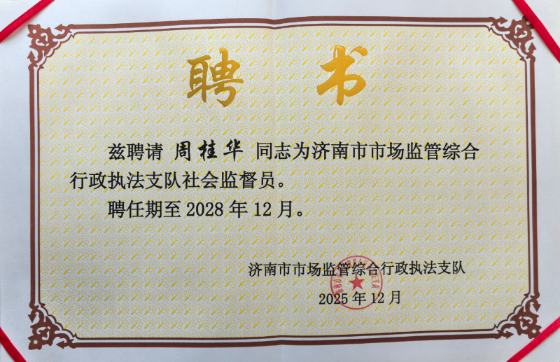 2025年12月3日,济南市市场监管局综合行政执法支队在中银大厦举行社会监督员聘任仪式,活动。来自社会各界的40名社会监督员受聘,槐荫区政协常委、山东正唐律师事务所主任周桂华受聘。市市场监管综合行政执法支队支队长郭春先为周桂华主任颁发聘书。