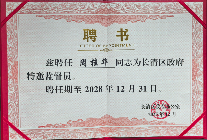 2025年12月11日,长清区人民政府举行特邀监督员聘任仪式,山东正唐律师事务所主任周桂华受聘,聘期至2028年12月31日。长清区委书记肖辉为周桂华主任颁发聘书。
